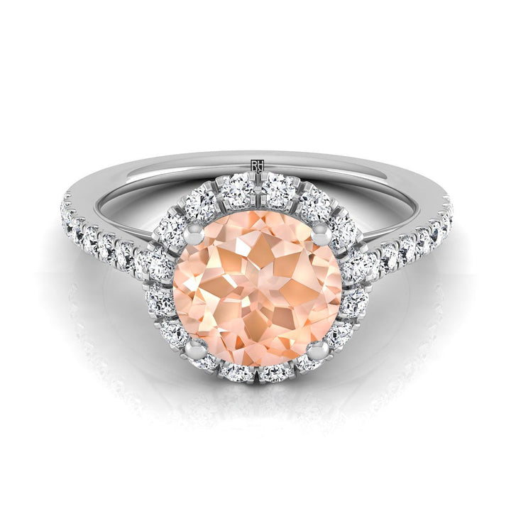 แหวนหมั้นทองคำขาว 18K ประดับมอร์แกไนต์ทรงกลมเจียระไนแบบบริลเลียนต์ พร้อมฮาโลขนาดเล็กและเพชรฝรั่งเศสแบบปาเว่ - 3/8ctw