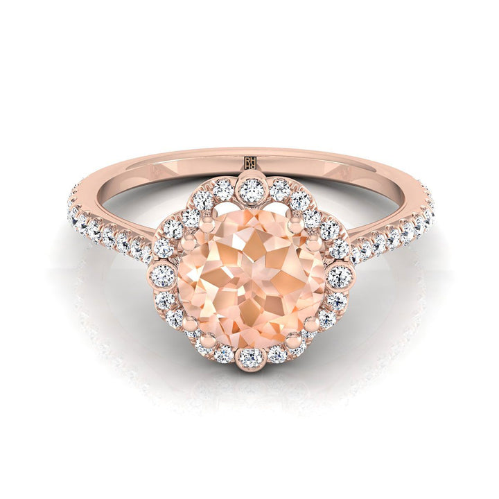 แหวนหมั้นสไตล์วินเทจประดับมอร์แกไนต์ทรงกลมเจียระไนแบบบริลเลียนท์ทองกุหลาบ 14K พร้อมฮาโลเพชรประดับละเอียด - 1/4ctw