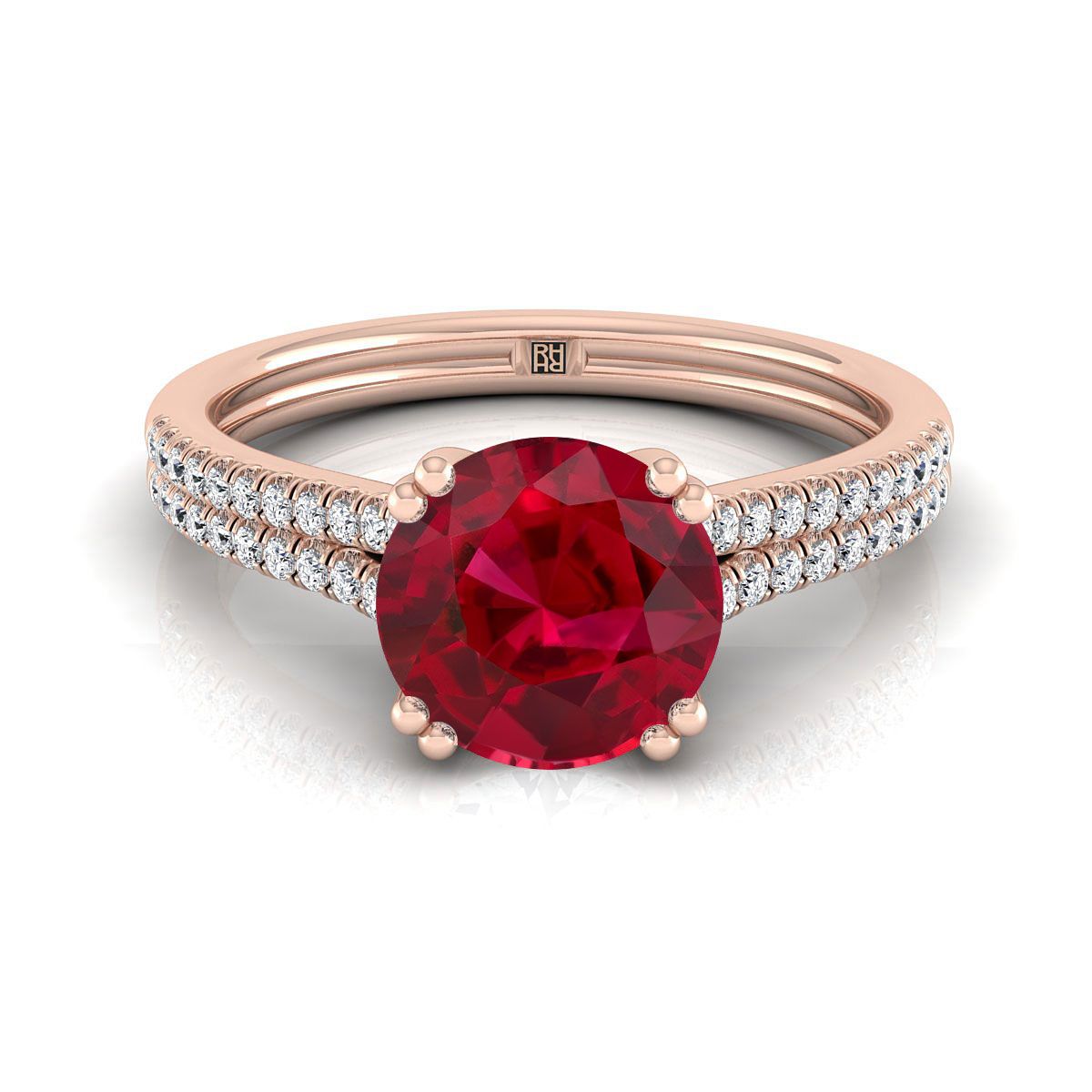 แหวนหมั้นเพชรฝรั่งเศสแบบฝังเพชรสองแถวสองกรงเล็บ รูบี้ทรงกลมเจียระไนแบบ Brilliant ทองกุหลาบ 14K - 1/6ctw