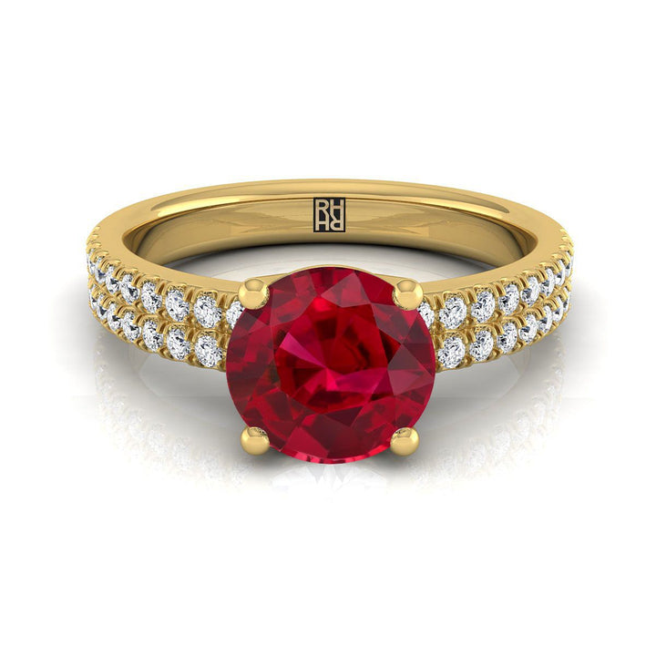 แหวนหมั้นแถวเพชรคู่แบบปาเว่ทรงกลมเจียระไนแบบบริลเลียนต์ประดับทับทิมทองคำเหลือง 18K - 1/4ctw