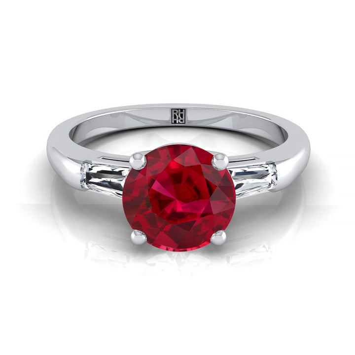 แหวนหมั้นทองคำขาว 14k พร้อมเพชรทับทิมทรงกลมขนาด 5 มม. ตรงกลาง และเพชรทรงบาแกตต์เรียว 2 เม็ด น้ำหนักรวม 0.18 กะรัต