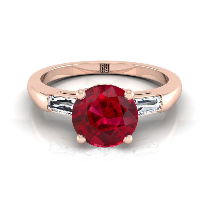 แหวนหมั้นทองคำชมพู 14k พร้อมเพชรทับทิมทรงกลมขนาด 5 มม. ตรงกลาง และเพชรทรงบาแกตต์เรียว 2 เม็ด น้ำหนักรวม 0.18 กะรัต