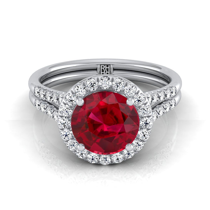 แหวนหมั้นทองคำขาว 18K ทรงกลมเจียระไนแบบบริลเลียนต์ ฝรั่งเศสปาเว่ ดีไซน์แยกชั้งแบบฮาโล - 3/8ctw