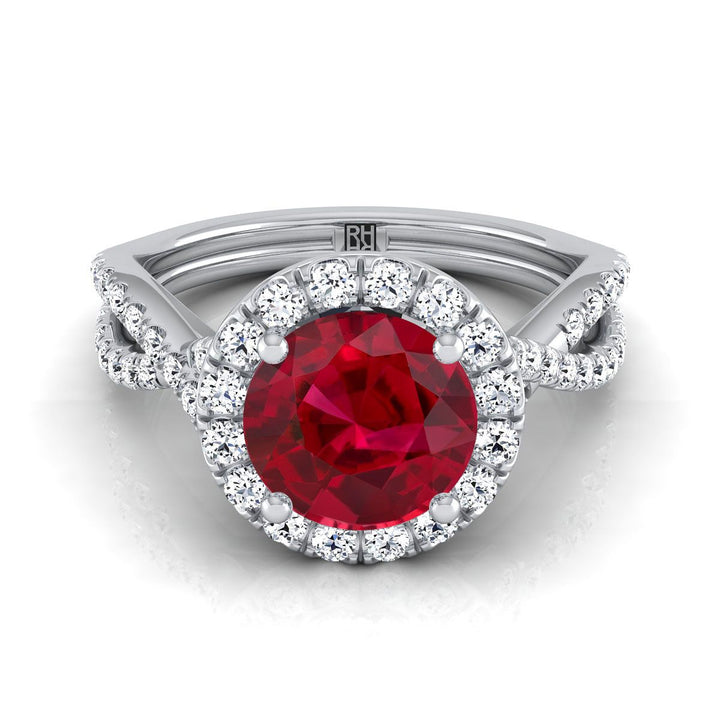 แหวนหมั้นทองคำขาว 18K ทรงกลมเจียระไนแบบ Brilliant ประดับทับทิม บิดเป็นลายคลื่น ประดับเพชร Pavé แบบ Halo รวม 1/2 กะรัต