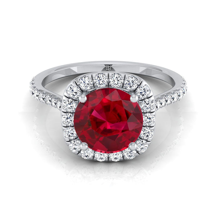 แหวนหมั้นทองคำขาว 14K ประดับทับทิมทรงกลมเจียระไนแบบ Brilliant พร้อมเพชรล้อมแบบ Shared Prong น้ำหนักรวม 3/8 กะรัต