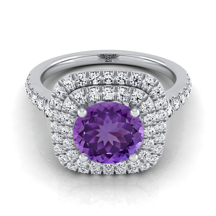 แหวนหมั้นทองคำขาว 18K ประดับอเมทิสต์ทรงกลมเจียระไนแบบ Brilliant พร้อมวงแหวนคู่แบบ Halo และเพชร Pavé ขอบหยัก - 1/2ctw