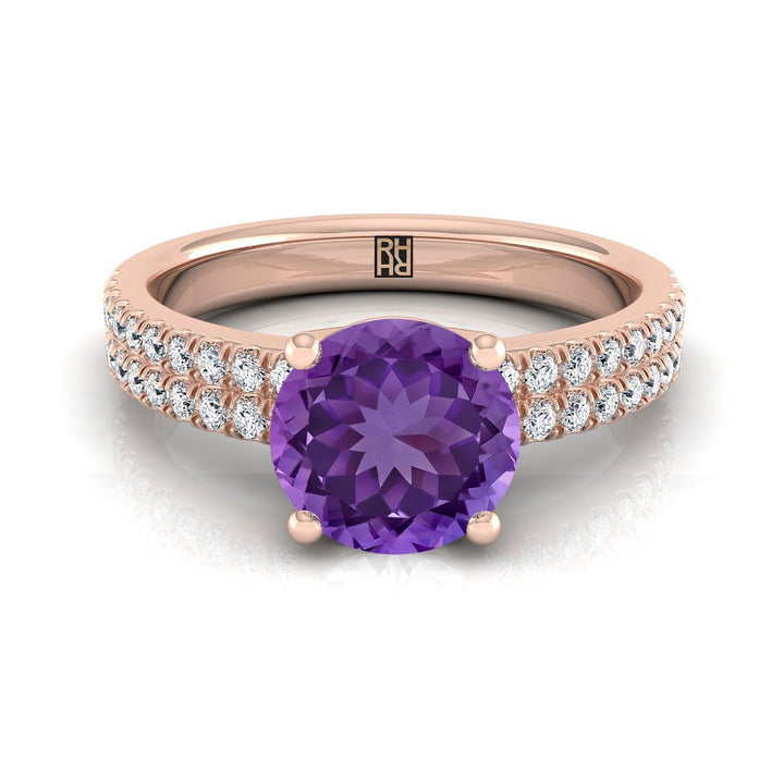 แหวนหมั้นแอมิทิสต์ทรงกลมเจียระไนแบบ Brilliant ประดับเพชรสองแถวแบบ Pave ทองกุหลาบ 14K - 1/4ctw