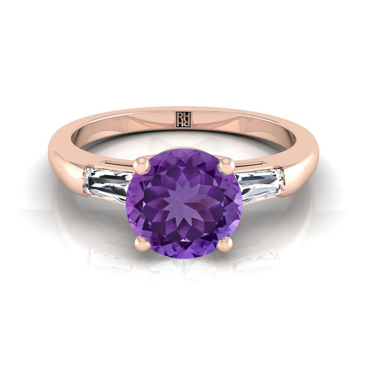 แหวนหมั้นทองคำชมพู 14k พร้อมอเมทิสต์ทรงกลมขนาด 6 มม. ตรงกลาง และบาแกตต์ทรงเรียว 2 เม็ด น้ำหนักรวม 0.18 กะรัต
