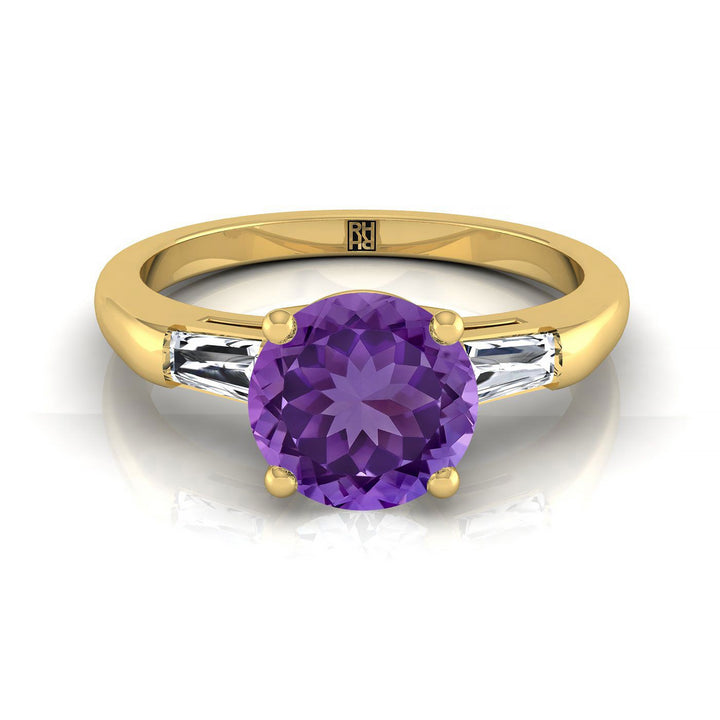 แหวนหมั้นอเมทิสต์ทรงกลมเจียระไนแบบ Brilliant สีทองเหลือง 14K ประกอบด้วยสามเม็ดหินทรงบาแกตต์แบบเรียว - 1/5ctw