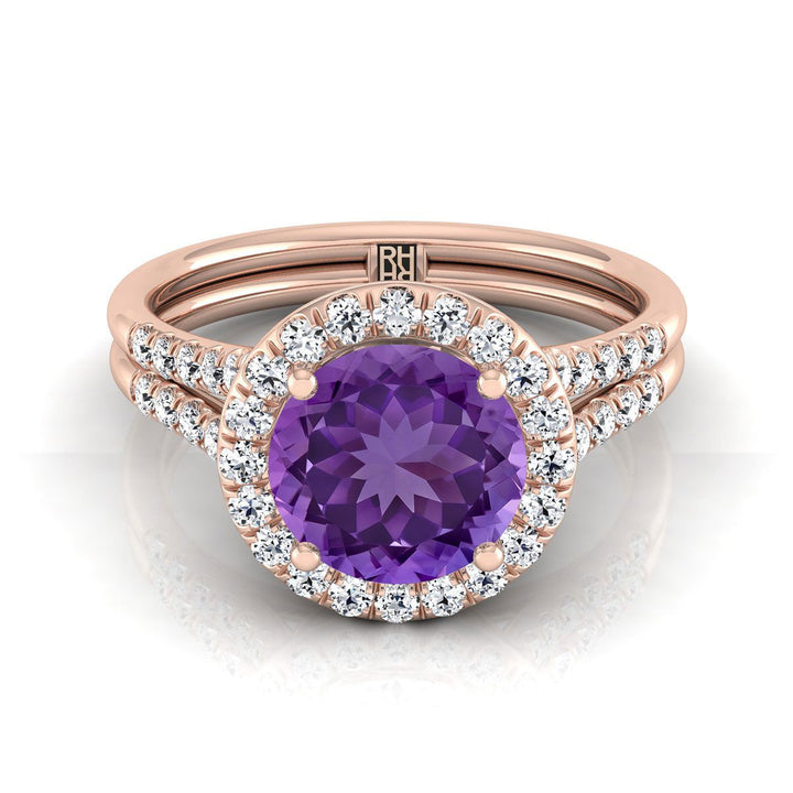 แหวนหมั้นทองคำชมพู 14k พร้อมอเมทิสต์ทรงกลมขนาด 6 มม. ตรงกลาง และเพชรทรงกลมเจียระไนแบบ Brilliant จำนวน 44 เม็ด น้ำหนักรวม 0.40 กะรัต
