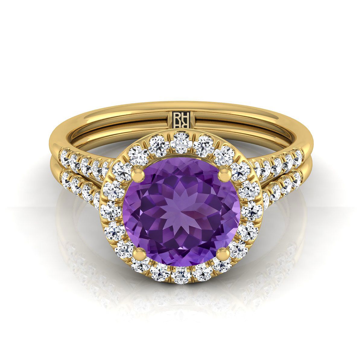 แหวนหมั้นทองคำเหลือง 14K ทรงกลมเจียระไนแบบบริลเลียนต์ ฝรั่งเศสประดับเพชรแบบปาเว่ แยกชิ้นแบบแหวนฮาโล - 3/8ctw