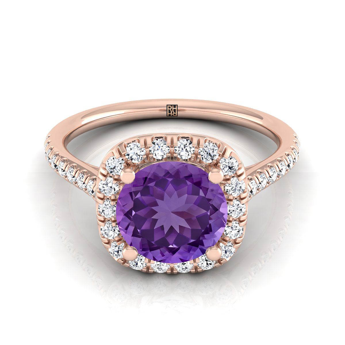 แหวนหมั้นอะเมทิสต์ทรงกลมเจียระไนแบบประกายแสงเรียบง่าย ประดับด้วยทองกุหลาบ 14K แบบหนามเตย พร้อมฮาโล - 1/3ctw