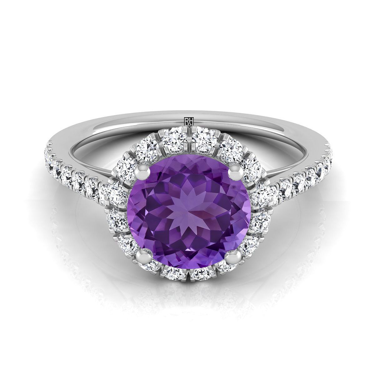 แหวนหมั้นทองคำขาว 14K ประดับอเมทิสต์ทรงกลมเจียระไนแบบบริลเลียนต์ พร้อมฮาโลขนาดเล็กและเพชรฝรั่งเศสแบบปาเว่ - 3/8 กะรัตรวม