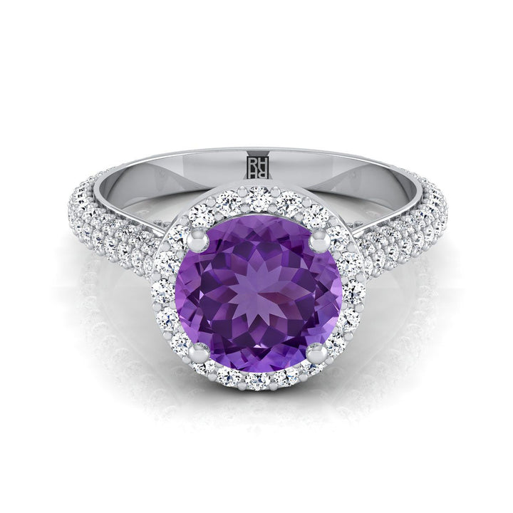 แหวนหมั้นทองคำขาว 18K ประดับอเมทิสต์ทรงกลมเจียระไนแบบ Brilliant พร้อมไมโครปาเว่และฮาโล่ พร้อมเพชรข้างแบบปาเว่ - 7/8ctw