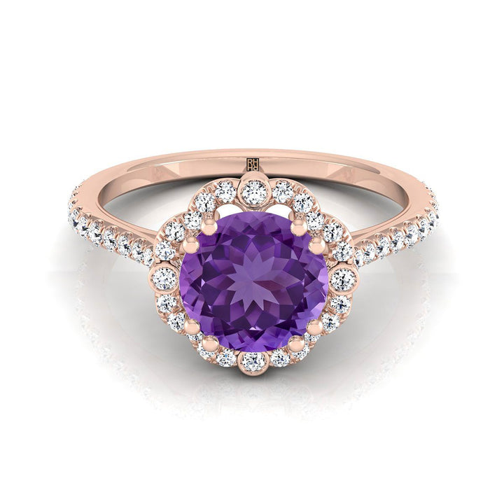 แหวนหมั้นดีไซน์วินเทจประดับอเมทิสต์ทรงกลมเจียระไนแบบบริลเลียนต์และเพชรล้อมแบบฮาโล่ทองกุหลาบ 14K น้ำหนักรวม 1/4 กะรัต