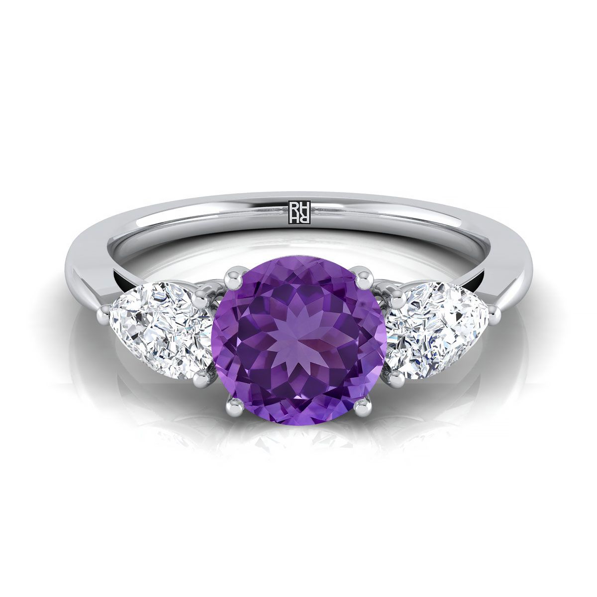 แหวนหมั้นทองคำขาว 14k พร้อมอเมทิสต์ทรงกลมขนาด 6 มม. ตรงกลาง และเพชรรูปทรงลูกแพร์ 2 เม็ด น้ำหนักรวม 1.00 กะรัต