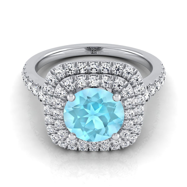 แหวนหมั้นทองคำขาว 14K ประดับอความารีนทรงกลมเจียระไนแบบ Brilliant พร้อมวงแหวนคู่และเพชร Pavé ขอบหยัก - 1/2ctw