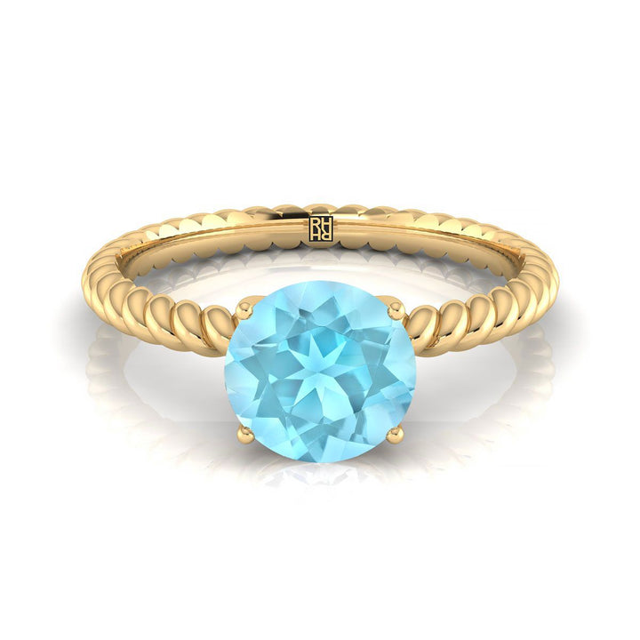 แหวนหมั้นทองคำ 14 กะรัต สีเหลือง พร้อมเพชรอะความารีนทรงกลมขนาด 6 มม. ที่กลาง และดีไซน์เชือกที่วงแหวน