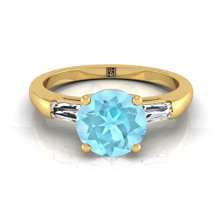 แหวนหมั้นทองคำ 14k สีเหลือง พร้อมอัญมณีหลักอะความารีนทรงกลมขนาด 6 มม. และบาแกตต์ทรงเรียว 2 เม็ด น้ำหนักรวม 0.18 กะรัต