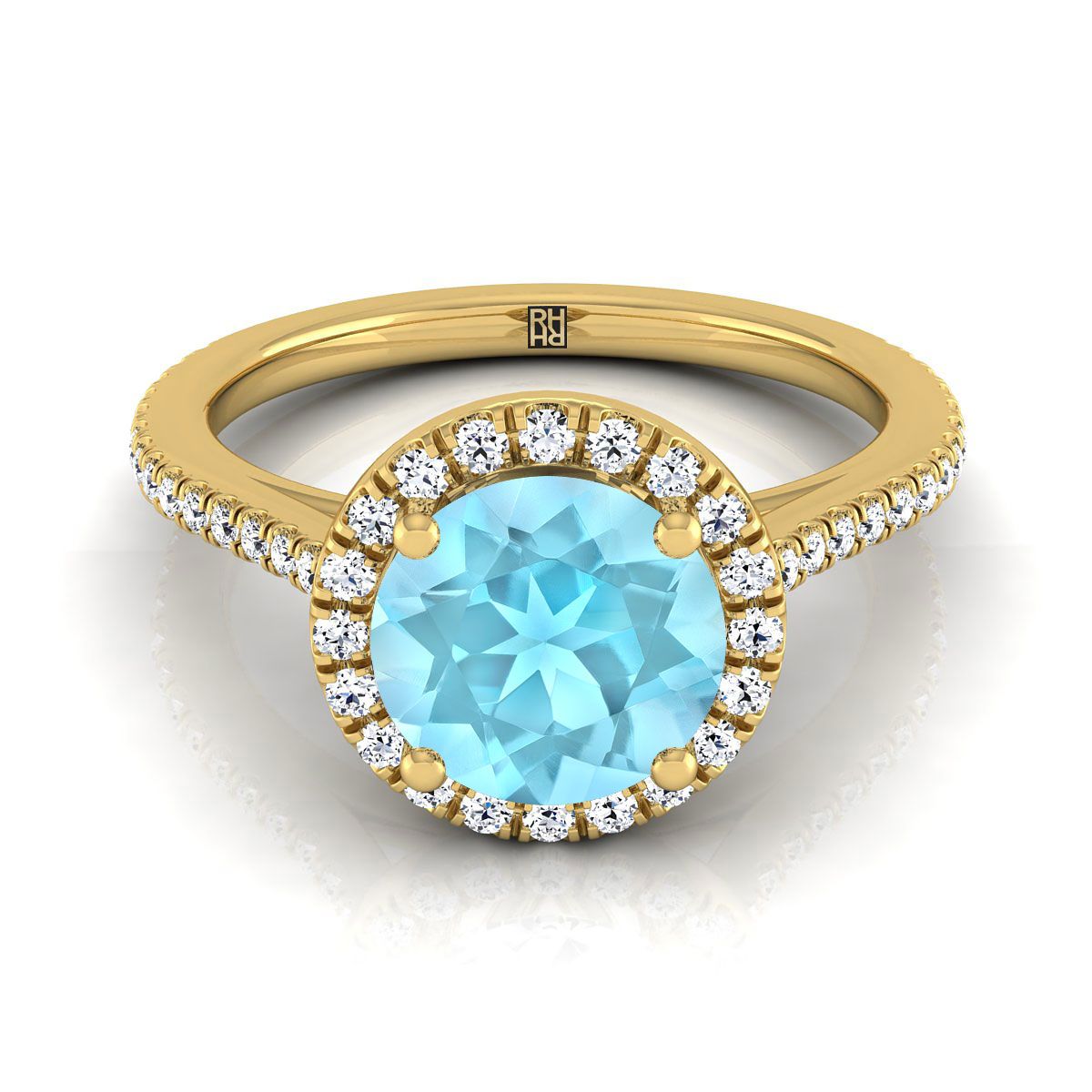 แหวนหมั้นทองคำ 18 กะรัต สีเหลือง พร้อมอัญมณีหลักทรงกลมขนาด 6 มม. สีอะความารีน และเพชรทรงกลมเจียระไนแบบ Brilliant จำนวน 50 เม็ด น้ำหนักรวม 0.25 กะรัต