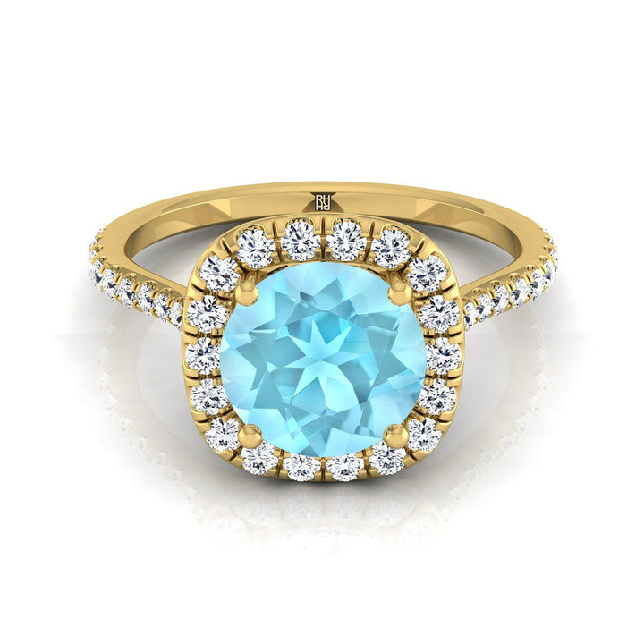 แหวนหมั้นทองคำเหลือง 14K ประดับอความารีนทรงกลมเจียระไนแบบ Brilliant พร้อมเพชรล้อมแบบ Shared Prong น้ำหนักรวม 3/8 กะรัต