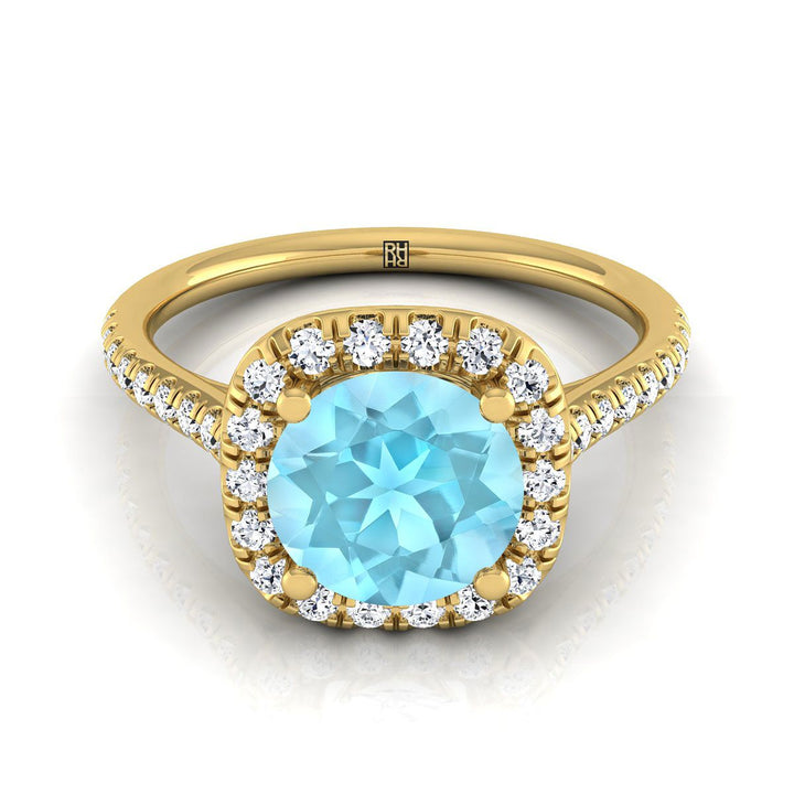 แหวนหมั้นอะความารีนทรงกลมเจียระไนแบบประกายเหลือง 18K แบบหนีบเรียบพร้อมฮาโล - 1/3ctw