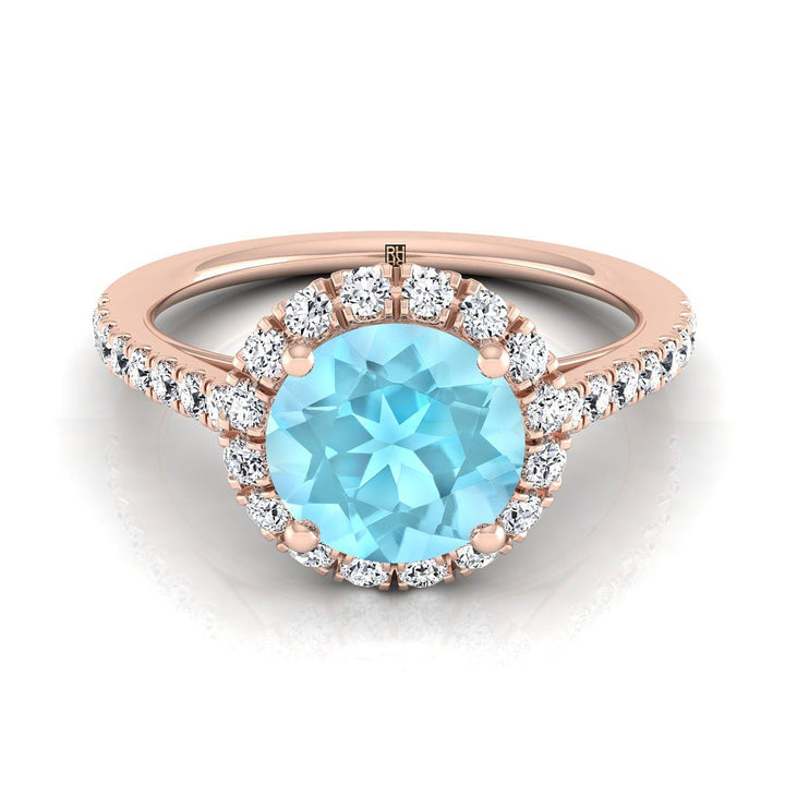แหวนหมั้นเพชรฝรั่งเศสแบบปาเว่รูปวงกลมเล็กประดับอความารีนทรงกลมเจียระไนแบบบริลเลียนท์ทองกุหลาบ 14K น้ำหนักรวม 3/8 กะรัต