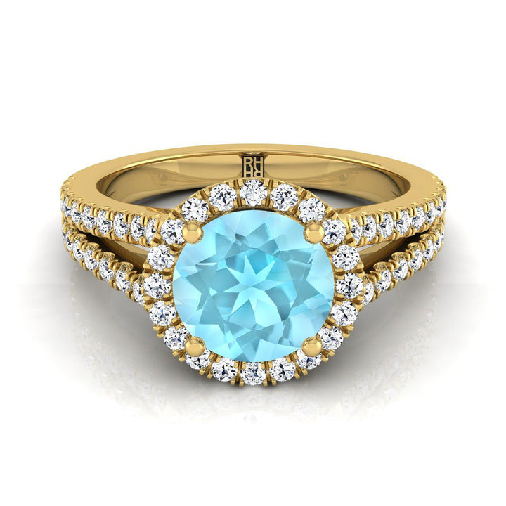 แหวนหมั้นทองคำเหลือง 18K ประดับอความารีนทรงกลมเจียระไนแบบ Brilliant พร้อมฮาโลรอบเม็ดกลางและชิ้นแยกแบบฝรั่งเศสประดับเพชร - 3/8ctw