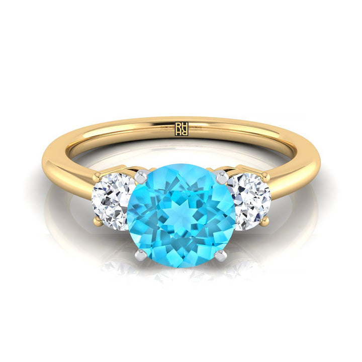 แหวนหมั้นเพชรสามเม็ดทรงกลมที่เข้าคู่กันอย่างสมบูรณ์แบบ ประกอบด้วยทับทิมสวิสสีน้ำเงินทรงกลมเจียระไนแบบ Brilliant ทำจากทองคำเหลือง 14K - น้ำหนักรวมเพชร 1/4 กะรัต