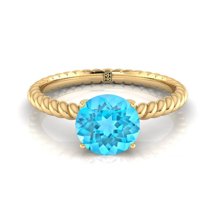 แหวนหมั้นทองคำ 14K สีเหลือง ประดับทับทิมสวิสสีน้ำเงินทรงกลมเจียระไนแบบ Brilliant พร้อมเชือกบิดเกลียวและเพชรเซอร์ไพรส์