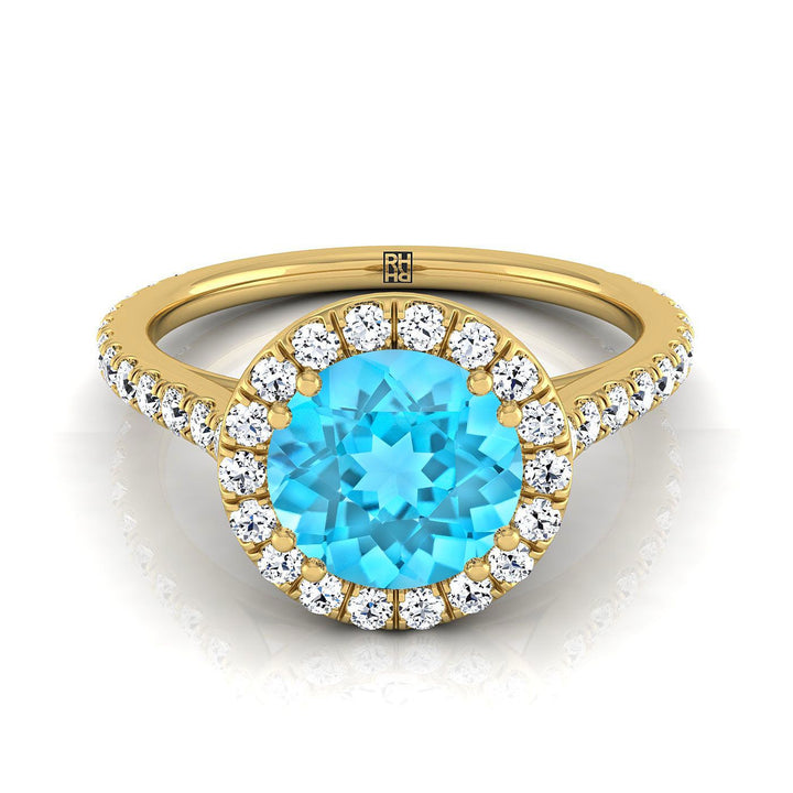 แหวนหมั้นเพชรแบบวงแหวนล้อมเพชรทรงกลมเจียระไนแบบบริลเลียนต์สีฟ้าสวิสแบบแนวนอนทองคำเหลือง 14K น้ำหนักรวม 1/2 กะรัต
