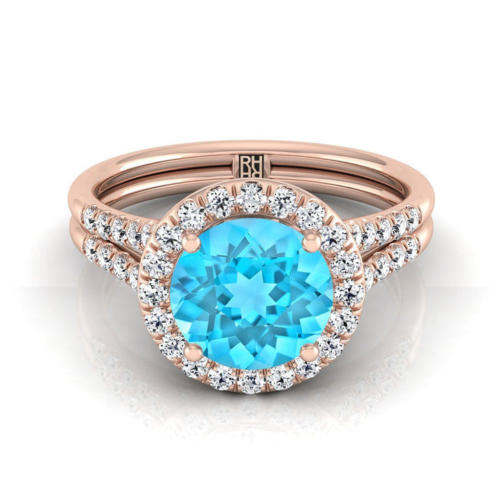 แหวนหมั้นทองคำชมพู 14K ทรงกลมเจียระไนแบบบริลเลียนต์ ฝรั่งเศสประดับเพชรแบบปาเว่ แยกช้างแหวนแบบฮาโล - 3/8ctw