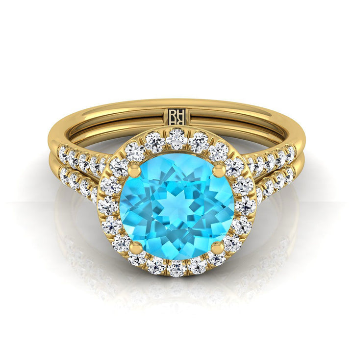 แหวนหมั้นทองคำเหลือง 14K ทรงกลมเจียระไนแบบบริลเลียนต์ ฝรั่งเศสประดับเพชรแบบปาเว่ แยกชิ้นแบบแหวนฮาโล - 3/8ctw