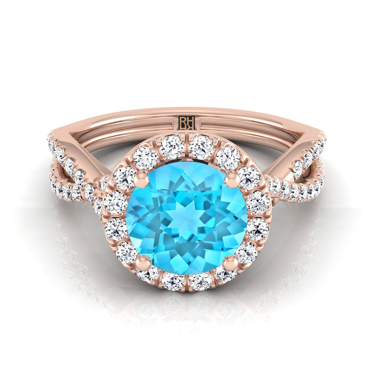 แหวนหมั้นทองคำ 14K ชมพู ทรงกลม ประดับทับทิมสวิสสีน้ำเงิน ทรงบิดขอบหยัก ประดับเพชรพาเว่ ฮาโล - 1/2 กะรัตรวม