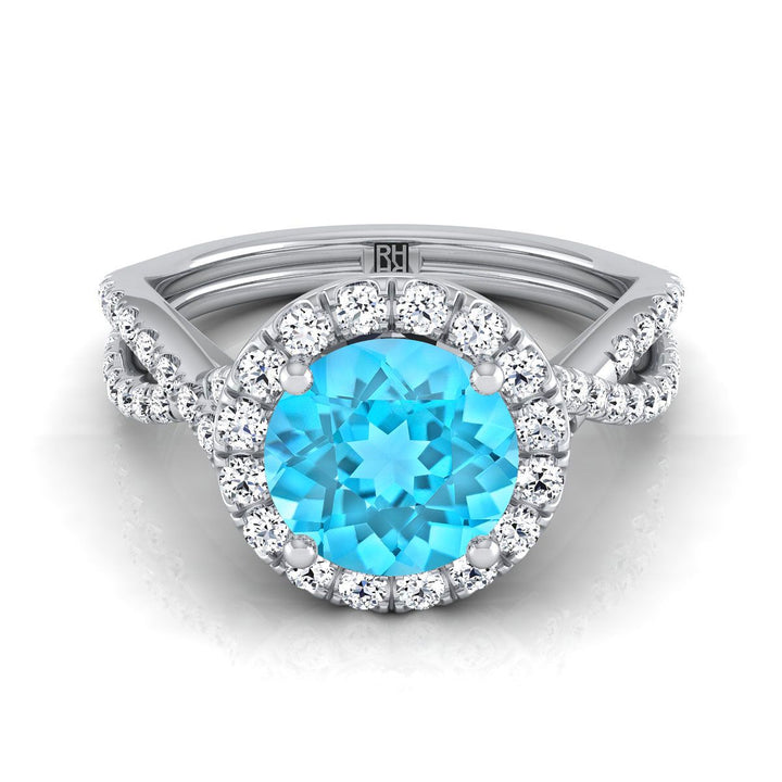 แหวนหมั้นเพชรทรงกลมเจียระไนแบบบริลเลียนท์แพลทินัม ประดับทับทิมสวิสสีน้ำเงินบลูท็อปาซแบบบิดขอบหยักและเพชรปาเว่ฮาโลขนาด 1/2 กะรัตรวม