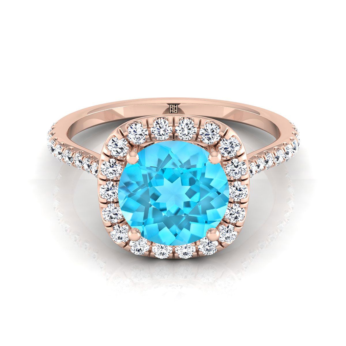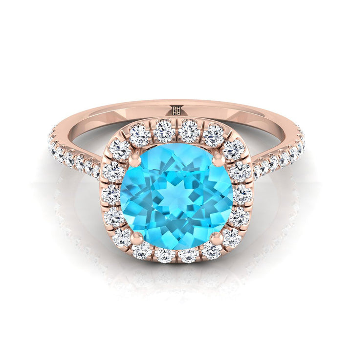 แหวนหมั้นทองคำ 14K โรสโกลด์ ประดับทับทิมสวิสสีน้ำเงินทรงกลมเจียระไนแบบ Brilliant พร้อมเพชรล้อมแบบ Shared Prong Halo - 3/8ctw
