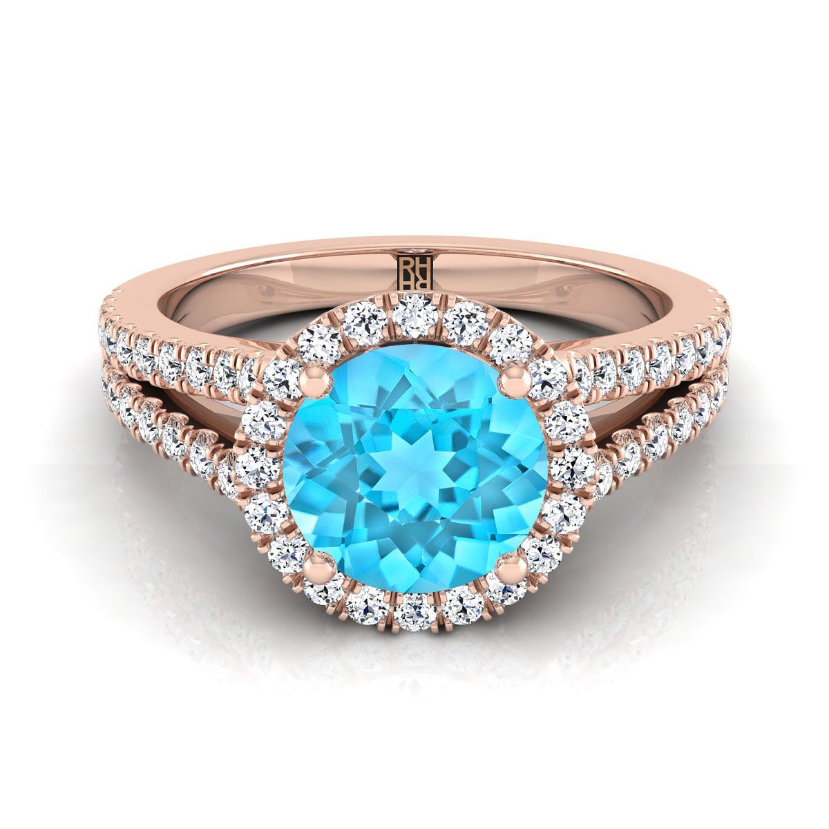 แหวนหมั้นทองคำ 14K โรสโกลด์ ประดับทับทิมสวิสสีน้ำเงินทรงกลมเจียระไนแบบ Brilliant พร้อมฮาโลรอบเม็ดกลางและแถบแยกแบบฝรั่งเศส ประมาณ 3/8 กะรัตรวม
