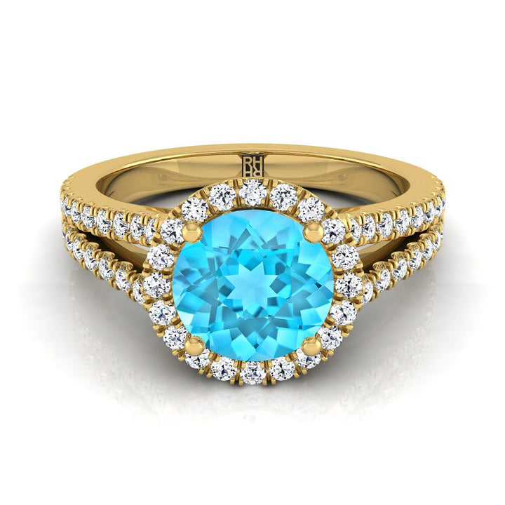 แหวนหมั้นทองคำเหลือง 14K ประดับทับทิมสวิสสีน้ำเงินทรงกลมเจียระไนแบบ Brilliant พร้อมวงแหวนแบบ French Pave และแยกชิ้น - 3/8ctw