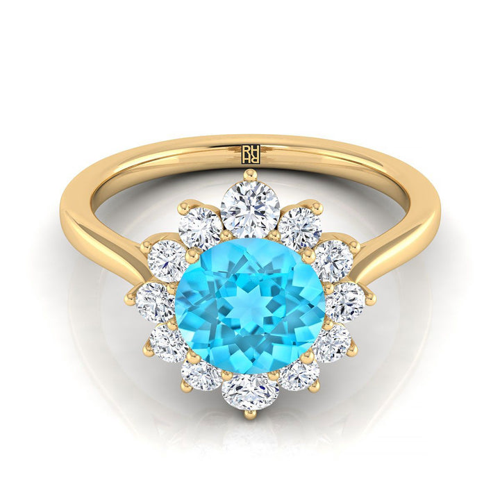 แหวนหมั้นทองคำเหลือง 14K ประดับทับทิมสวิสสีน้ำเงินทรงกลมเจียระไนแบบ Brilliant พร้อมล้อมเพชรลายดอกไม้ - 1/2ctw