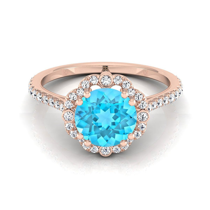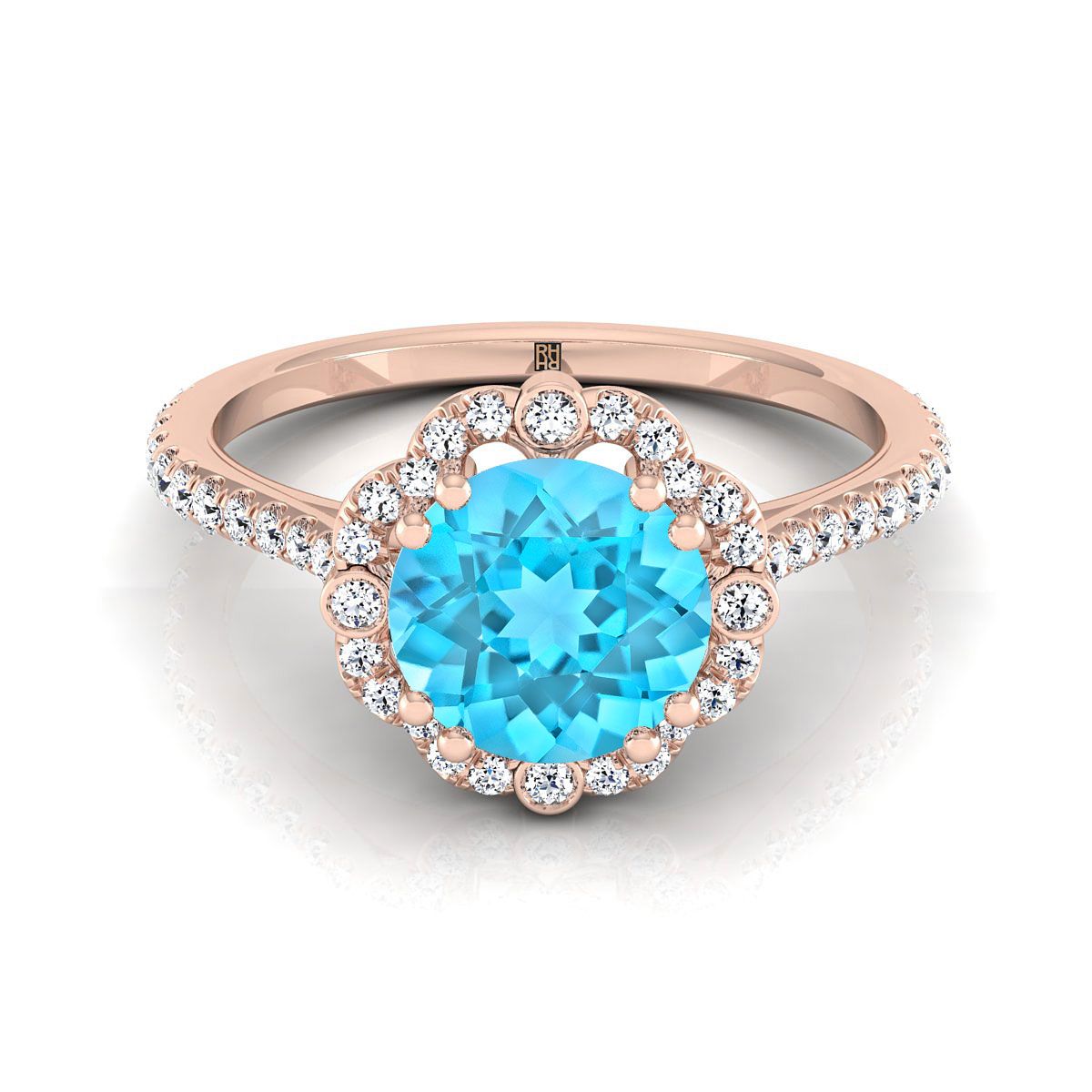 แหวนหมั้นดีไซน์วินเทจประดับทับทิมสวิสสีน้ำเงินทรงกลมเจียระไนแบบ Brilliant จากทองกุหลาบ 14K พร้อมเพชรล้อมแบบ Halo น้ำหนักรวม 1/4 กะรัต