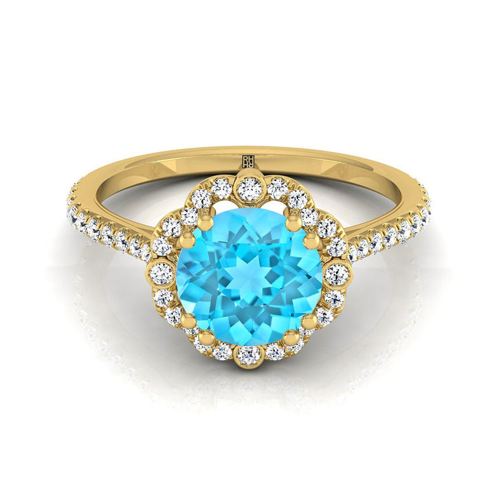 แหวนหมั้นดีไซน์วินเทจประดับทับทิมสวิสสีน้ำเงินทรงกลมเจียระไนแบบ Brilliant จากทองคำเหลือง 14K พร้อมเพชรล้อมแบบ Halo น้ำหนักรวม 1/4 กะรัต