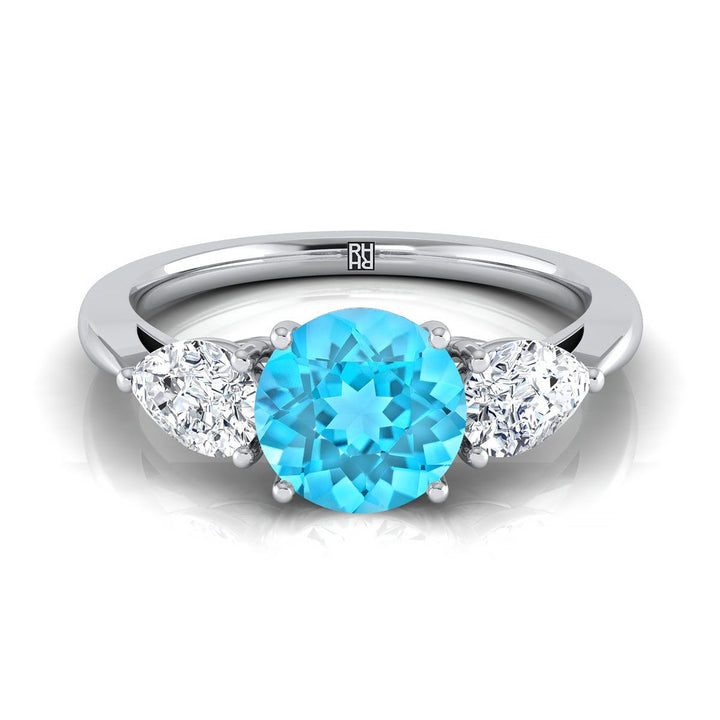 แหวนหมั้นเพชรสามเม็ดรูปทรงลูกแพร์ที่เข้าคู่กันอย่างสมบูรณ์แบบ ประดับด้วยทับทิมสวิสสีน้ำเงินทรงกลมเจียระไนแบบ Brilliant จากทองคำขาว 18K - 7/8ctw