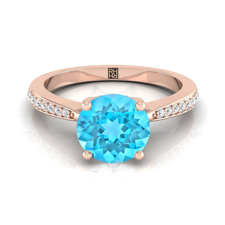 แหวนหมั้นเพชรแบบปาเว่ทรงกลมเจียระไนแบบบริลเลียนต์สวิสบลูโทแพซสีฟ้าทองกุหลาบ 14K - 1/8ctw