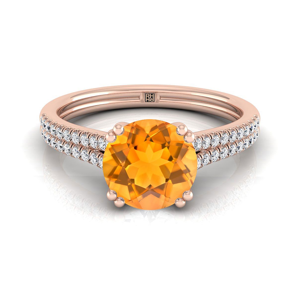 แหวนหมั้นเพชรฝรั่งเศสแบบฝังเพชรสองแถวสองกรงเล็บทรงกลมเจียระไนแบบบริลเลียนต์สีซิทรินทองกุหลาบ 14K - 1/6ctw