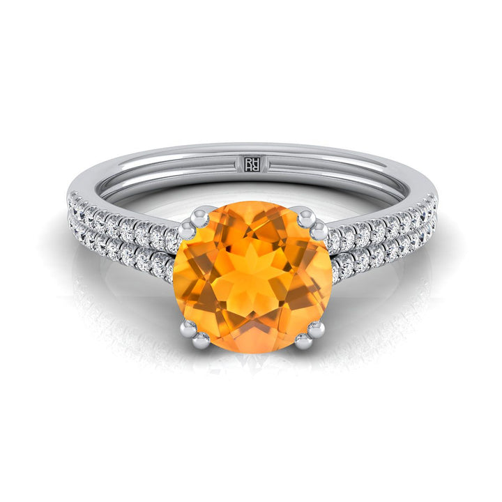 แหวนหมั้นเพชรฝรั่งเศสแบบฝังเพชรสองแถวสองกรงเล็บ ประกอบด้วยซิทรินทรงกลมเจียระไนแบบบริลเลียนต์สีทองขาว 14K - 1/6 กะรัตรวม