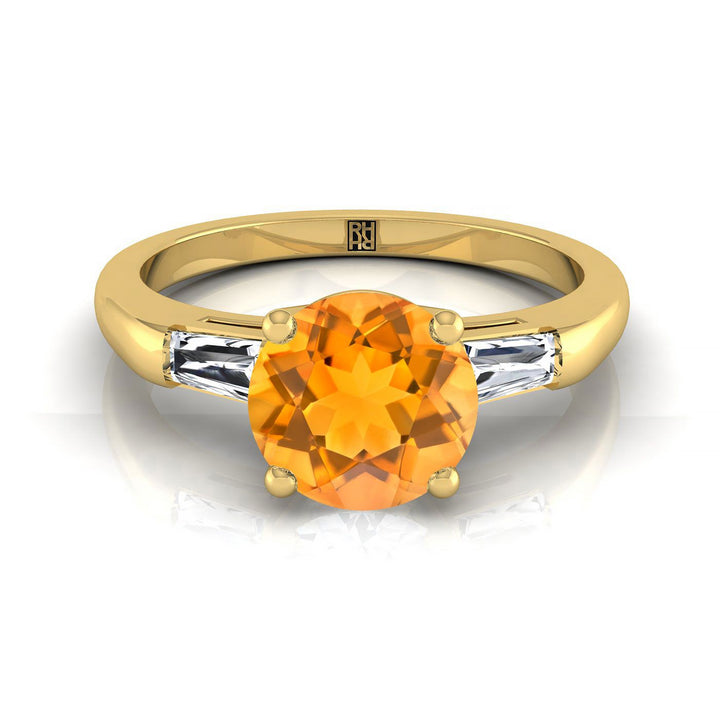 แหวนหมั้นทองคำ 18k สีเหลือง พร้อมด้วยพลอยซิทรินทรงกลมขนาด 6 มม. ที่ศูนย์กลาง และเพชรทรงบาแกตต์เรียว 2 เม็ด น้ำหนักรวม 0.18 กะรัต