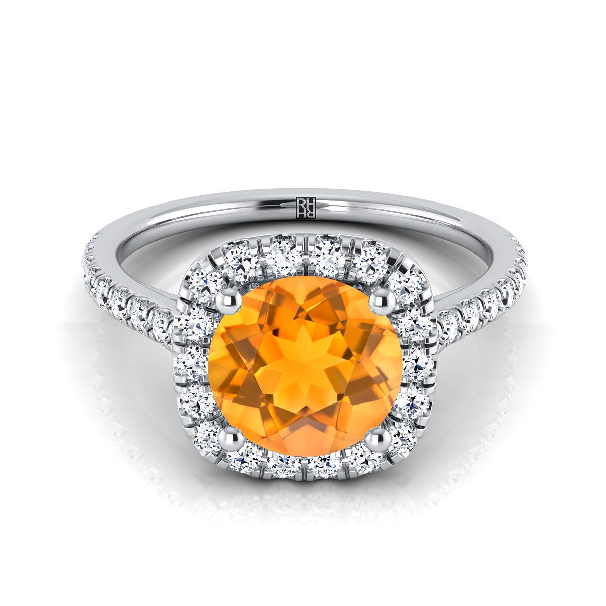 แหวนหมั้นทองคำขาว 18k พร้อมพลอยซิทรินทรงกลมขนาด 6 มม. ตรงกลาง และเพชรทรงกลมเจียระไนแบบ Brilliant จำนวน 36 เม็ด น้ำหนักรวม 0.33 กะรัต