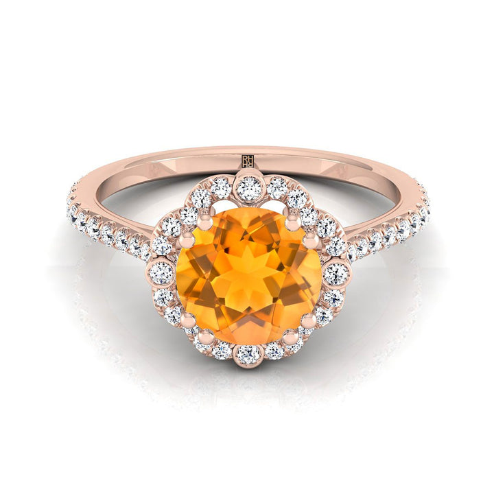 แหวนหมั้นแบบวินเทจประดับซิทรินทรงกลมเจียระไนแบบบริลเลียนต์สีโรสโกลด์ 14K พร้อมฮาโลเพชรประดับละเอียด 1/4 กะรัต