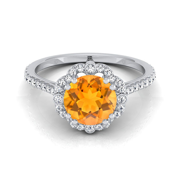 แหวนหมั้นแบบวินเทจประดับซิทรินทรงกลมเจียระไนแบบบริลเลียนต์สีขาว 14K พร้อมฮาโลเพชรประดับละเอียด 1/3 กะรัตรวม