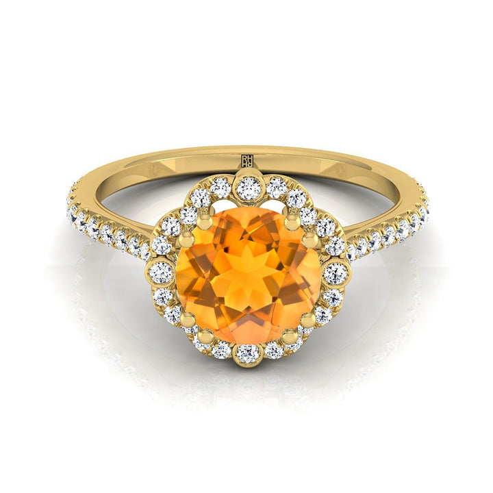 แหวนหมั้นแบบวินเทจประดับซิทรินทรงกลมเจียระไนแบบบริลเลียนต์สีเหลืองทอง 18K พร้อมฮาโลว์เพชรประดับอย่างประณีต - 1/4ctw